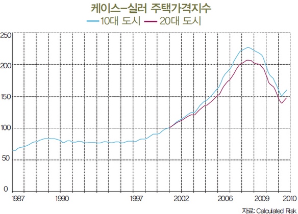서브프라임 모기지 사태를 전후해 세계적으로 유명해진 ’케이스-실러 지수’(Case-Shiller Home Price Indices)는 보스턴·로스앤젤레스·뉴욕 등 미국 10대 도시에 애틀랜타·디트로이트 등을 추가한 20대 도시의 주택가격을 종합한 지수다. 모든 대도시를 대상으로 하지 않는 이유는 거래내역을 충분히 수집할 수 없어서다. 텍사스와 같은 일부 지역에서는 아예 거래 가격을 공개하지 않는다고 한다. 1980년대 반복매매기법을 개발한 칼 케이스와 로버트 실러 교수의 이름을 땄다. 주택가격지수와는 달리 서브프라임 모기지 등 비우량 대출로 구입한 주택가격이 포함돼 가장 신뢰할 만한 지수로 평가받고 있다. 신용평가회사인 스탠더드앤푸어스에서 매월 마지막 주 화요일에 발표하는데, 2000년 1월을 기준 수치(100)로 잡았다. 3개월 동안 축적된 거래 내역을 평균해 지수를 산출하며 2개월의 시차가 발생한다. 11월 마지막 주 화요일인 지난 24일 발표된 케이스-실러 지수는 9월 지수로, 7~9월에 거래된 주택가격 자료로 산출됐다.