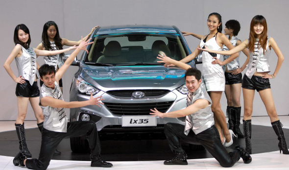 11월23일 중국 광저우의 수출입 상품 교역회 전시관에서 열린 ‘2009 광저우 모터쇼’에서 현대자동차 모델들이 소형 SUV ‘ix35’(국내명 투싼ix)를 중국 시장 최초로 선보이고 있다. 연합