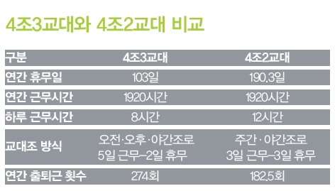 용광로 공장을 24시간 가동하는 철강기업들이 주로 채택하고 있는 근무 형태는 3조3교대다. 하루 8시간씩 근무하되 낮, 밤, 철야로 근무시간을 바꿔가며 일한다. 이와 달리 직원을 네 조로 나누는 4조3교대에서는, 하루 8시간씩 일하는 건 같지만 보통 5∼7일 일하고 이틀 쉰 뒤 근무시간을 바꿔 다시 5∼7일 일하는 식으로, 한 조는 항상 휴식을 취하게 된다. 반면 1998년 유한킴벌리가 가장 먼저 도입한 4조2교대제는 하루에 2개조가 12시간씩 일하고 나머지 2개조는 쉬는 방식이다. 하루 12시간씩 3일(또는 4일)을 일하고 3일(또는 4일)을 쉰 뒤 다시 12시간씩 3일(또는 4일)을 일한다. 그러면 연간 190일의 휴무일이 발생한다. 4조3교대에 견줘 연간 휴일이 두 배 가까이 많아진다(표 참조). 포스코는 오는 4월에 포항·광양제철소의 70여 공장 중 여건이 갖춰지는 곳부터 4조2교대를 시행할 방침이다.