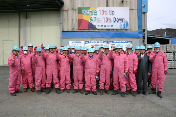 4조2교대제는 휴일이 크게 늘어나는 대신 하루 12시간 노동의 피로감을 감수해야 한다. 4조2교대제를 실시하고 있는 포스코 계열사 삼정P&A공장에서 작업자들이 파이팅을 외치고 있다. 삼정P&A 제공