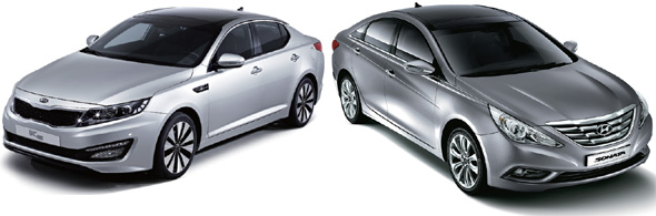 중형차 내수시장에서 치열한 ‘형제 경쟁’을 벌이고 있는 기아차 K5(왼쪽)와 현대차 YF쏘나타.