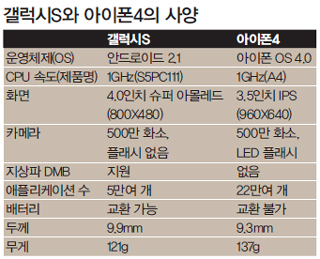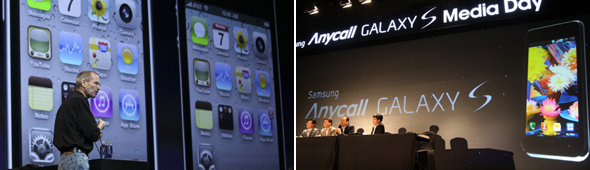 6월8일 새벽 2시(한국시각) 애플의 최고경영자(CEO) 스티브 잡스는 미국 샌프란시스코에서 열린 애플의 세계개발자회의(WWDC·Worldwide Developers Conference)에서 신제품 ‘아이폰4’의 출시를 발표했다. 그로부터 8시간 뒤인 오전 10시에는 삼성전자가 서울 서초동 사옥에서 새로운 스마트폰 ‘갤럭시S’ 국내 출시 행사를 열었다. 공교롭게도 최신 성능을 탑재한 두 가지의 휴대전화가 같은 날 선보인 것이다. 자신만만한 두 회사 제품의 승부를 예견해봤다.