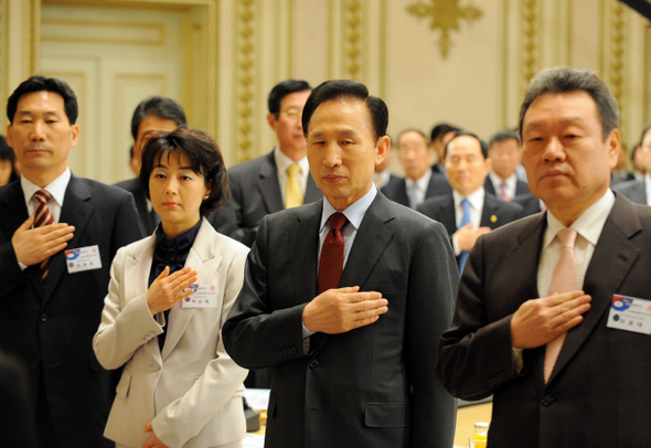 메가뱅크 ‘띄우기’는 청와대의 의중이 반영된 것으로 보인다. 지난해 청와대에서 열린 행사에서 나란히 선 이명박 대통령과 어윤대 KB금융지주 회장 내정자(맨 오른쪽). 청와대사진기자단