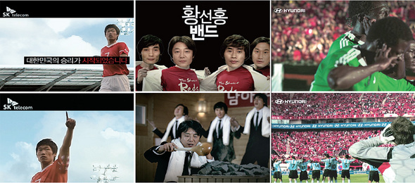 현대차와 SK텔레콤, KT 등 월드컵 마케팅에 집중한 기업들은 ‘애국심’에 호소하는 광고를 월드컵 기간 내내 선보였다. 광고업계는 사상 첫 원정 16강 진출로 광고 효과를 높였다고 평가하지만, 지나친 ‘애국 마케팅’에 대한 비판도 나온다. SK텔레콤, KT, 현대차의 방송광고 화면(왼쪽부터 SK텔레콤·KT·현대차 제공).
