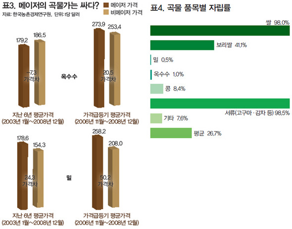 표3. 메이저의 곡물가는 싸다? 표4. 곡물 품목별 자립률