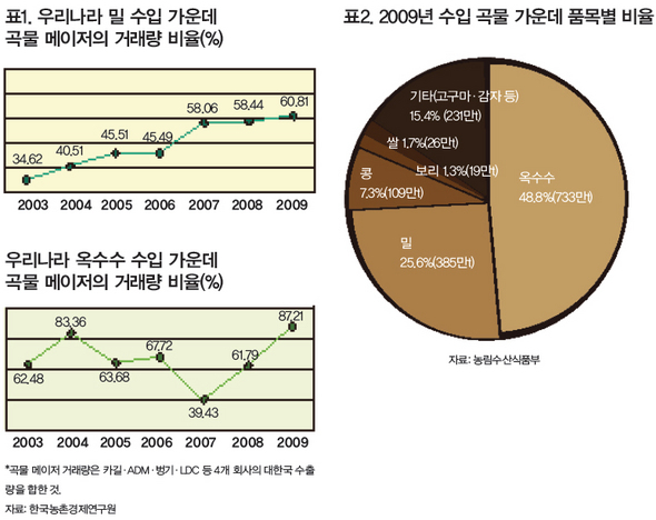 표1. 우리나라 밀 수입 가운데 곡물 메이저의 거래량 비율(%) 표2. 2009년 수입 곡물 가운데 품목별 비율
