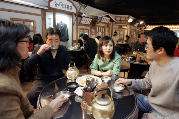 막걸리가 인기를 끌고 있다. 다른 술에 비해 많은 영양성분이 들어 있을 뿐만 아니라 피로물질을 제거하는 데도 좋다. 서울 영등포시장 대폿집에서 사람들이 술잔을 기울이고 있다. 사진 한겨레 김정효 기자 hyopd@hani.co.kr