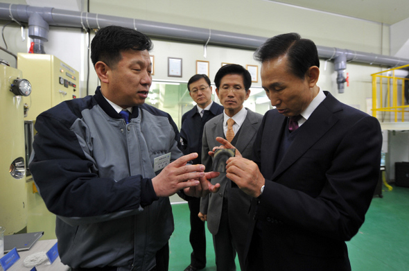 이명박 대통령이 지난 2월5일 경기 안산시 상록구 경기테크노파크에서 열린 2010년도 경기도 업무보고를 마치고 한 부품업체를 찾아 제품을 살펴보고 있다. 대기업의 납품단가 연동제 반대는 독과점을 배경으로 한 횡포다. 사진 청와대사진기자단