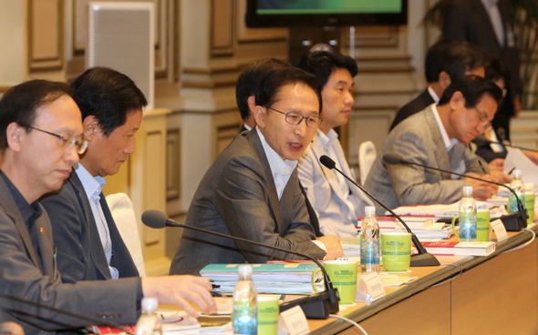 이명박 대통령이 지난 9월5일 청와대에서 열린 장차관 워크숍에서 공정사회 구현을 위한 국정운영 방향에 대해 당부의 말을 하고 있다. 청와대사진기자단