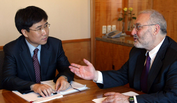 장하준 교수가 노벨경제학상 수상자인 스티글리츠 교수와 대담하고 있다.한겨레 황석주