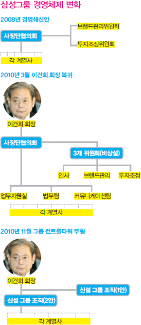 이인용 부사장은 이에 대해 “이건희 회장은 중국 출장을 마치고 돌아온 후 ‘21세기 변화가 예상보다 더 빠르고 심하다. 삼성이 지난 10년간 21세기 변화를 대비해왔지만 곧 닥쳐올 변화를 생각하면 턱없이 부족하다. 미래에 대비하기 위해서는 그룹 전체의 힘을 다 모으고 사람도 바꿔야 한다’고 밝히고 그룹 조직을 다시 만들라고 했다”고 밝혔다. 또 김순택 부회장에 대해서는 “그동안 삼성SDI의 최고경영자(CEO)로서 유기발광다이오드, 2차 전지 등 신사업을 핵심 사업으로 키웠으며, 금년부터는 삼성전자의 신사업추진단장으로서 그룹의 미래 사업을 준비해왔다”며 “신설되는 그룹 조직은 그룹 차원에서 21세기의 급변하는 경영 환경에 대응하고 미래 신사업을 육성하는 한편, 그룹 경영의 시너지 효과를 높이는 데 집중하게 될 것”이라고 말했다.