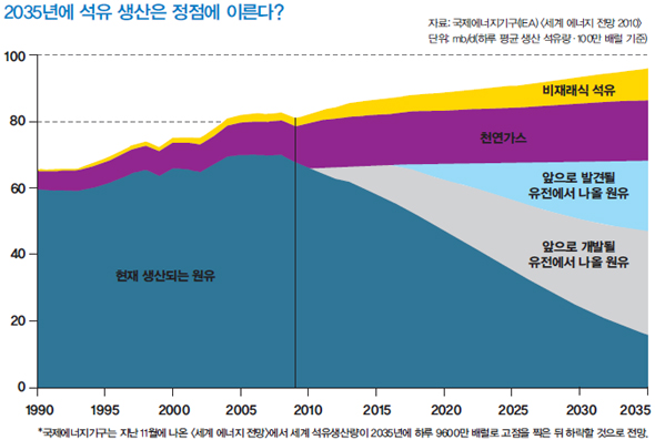 올해 멕시코만 기름 유출 사고가 나자, 석유 종말론은 다시 미국 사회를 흔들었다. 지난 11월15일 기사를 보면, 미국 캘리포니아 주립 데이비스대학의 연구진은 석유가 2041년께 고갈될 것이라고 전망했다. 연구진은 석유 매장량과 인류의 석유 소비 증가 속도를 계산해 뽑아낸 결과라고 설명했다. 또 한 번의 종말론이다.