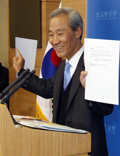 김종훈 통상교섭본부장이 지난 12월5일 서울 외교통상부에서 연 한-미 자유무역협정 관련 기자회견에서 합의문을 공개하고 있다.연합