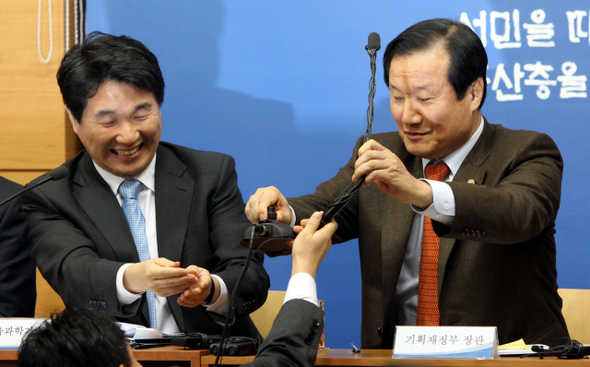 지난 1월13일 오전 경기 과천시 중앙동 정부과천청사 1브리핑룸에서 열린 ‘서민물가 안정을 위한 종합대책’ 발표에서 윤증현 기획재정부 장관(오른쪽)과 이주호 교육과학기술부 장관이 웃고 있다.한겨레 박종식