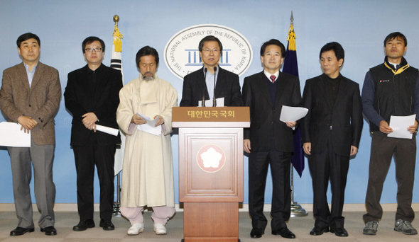 지난 1월23일 오전 국회에서 천정배 민주당 최고위원(가운데)이 이종걸 의원(맨 왼쪽), 강기갑 민주노동당 의원(왼쪽에서 세 번째) 등과 함께 “한-미 자유무역협정 비준 저지를 위해 노동계와 함께 미국을 방문하겠다”고 밝히고 있다.한겨레 탁기형