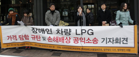 지난 1월25일 오전 10시 서울 종로구 서린동 SK 본사 사옥 앞에서 전국장애인부모연대 회원들이 기자회견을 열고 있다. 이들은 이날 장애인 부모 717명을 대표해 SK가스와 SK에너지를 포함한 6개 LPG 업체를 대상으로 손해배상 청구소송을 제기했다.전국장애인부모연대 제공