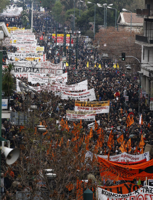 그리스 공공·민간 부문 근로자 2만여 명이 지난해 12월15일 공기업 임금 삭감에 항의해 거리행진을 하고 있다. 그리스 재정 파탄의 원인 가운데 하나는 2004년 올림픽 유치에 쏟아부은 160억달러어치의 정부 지출이었다.연합