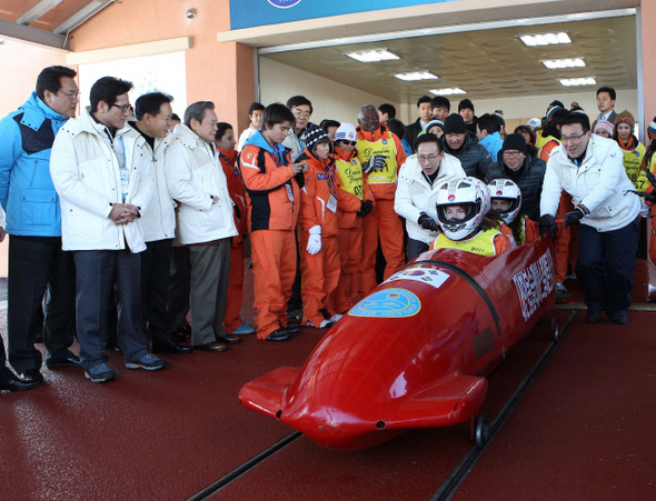 지난 2월15일 이명박 대통령이 강원도 평창 알펜시아 봅슬레이 훈련장을 방문했다. 이 대통령은 이날 현지에서 국제올림픽위원회(IOC) 실사단 일행을 만나 환영 리셉션을 가졌다.청와대사진기자단
