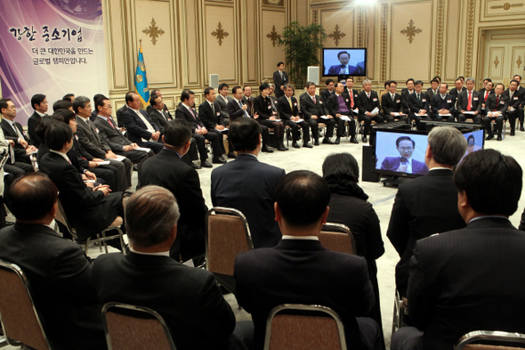 이명박 대통령이 지난 1월26일 청와대에서 열린 중소기업 경쟁력 제고를 위한 간담회에서 인사말을 하고 있다.한겨레 김봉규