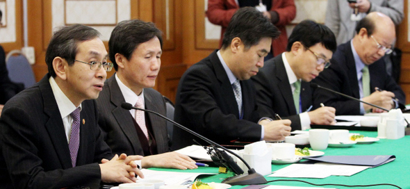 지난 2월17일 김동수 공정거래위원장(맨 왼쪽)이 국회 귀빈식당에서 하도급법 개정안을 논의하기 위한 당정회의에 앞서 인사말을 하고 있다.한겨레 김경호