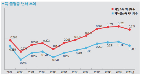 무엇보다 소득불평등 수준을 나타내는 대표적인 기준인 지니계수가 줄었다. 도시 2인 이상 가구 가처분소득 지니계수는 2009년 0.295까지 올랐지만, 2010년에 0.289로 떨어졌다. 지니계수는 보통 0~1을 오가는 지수로, 모든 사람이 똑같이 소득을 나누면 0, 단 한 사람이 모든 소득을 챙기면 1이 된다. 한 사회에서 소득이 일부에게 쏠릴수록 지수는 1에 가깝게 접근한다. 노무현 정권 때는 양극화가 심화하면서 지수가 1 쪽으로 조금씩 이동했다. 시장소득 지니계수가 5년 사이 0.024 올랐다(표1 참조). 그 지니계수가 이명박 정권이 들어선 뒤 2009년에는 옆으로 느슨하게 이동하더니, 2010년에는 0.006만큼 떨어졌다. 놀라운, 이해하기 힘든 반전이었다.