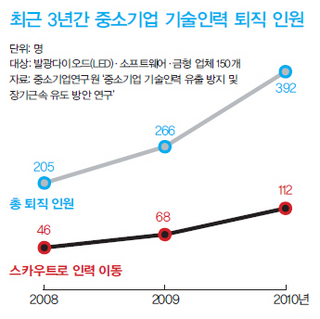 이런 상황은 중소기업연구원이 최근 발간한 ‘중소기업 기술인력 유출 방지 및 장기근속 유도 방안 연구’에서도 확인된다. 연구원은 대기업의 인력 빼가기가 늘고 있는 3개 업종(LED업·금형업·소프트웨어업)의 150개 업체를 대상으로 기술인력의 퇴직 현황을 물은 결과 2008년 205명에서 2010년 392명으로 늘었다고 밝혔다. 이들 가운데 스카우트를 통한 인력 유출은 같은 기간 46명에서 112명으로 는 것으로 파악됐다. 중소기업연구원 황성수 박사는 “최근 들어 경쟁 중소기업보다 대기업의 중소기업 기술인력 빼가기가 심해지고 있다”며 “대기업과의 관계 때문에 명확하게 밝히지 않은 경우도 있어 조사 결과보다 더 많은 인력 유출이 있었을 것”이라고 말했다.