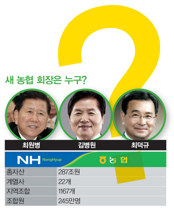 11월18일 농협의 제5대 회장이 뽑힌다. 은행·보험·증권 등 계열사 22개를 거느리고 총자산이 287조원에 이르는 거대 금융그룹의 최고 수장을 뽑는 자리다. 하지만 선거를 치르기도 전에 후보 자격 시비가 일고 불법 선거운동에 따른 검찰 수사가 시작되는 등 재선거 우려가 나오고 있다.