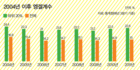 없는 사람들부터 살기 어려워졌다. 최근 발표한 통계청의 3분기 가계 동향을 보면 소득 하위 20% 가구가 한 달에 쓴 돈(소비지출)은 평균 122만3200만원이며, 이 가운데 먹고 마시는 데(주류 제외) 27만9400원을 썼다. ‘소비지출에서 식료품 지출이 차지하는 비중’인 엥겔계수가 22.8%다. 2004년 3분기(24.4%) 이후 7년 만에 최대치다. 반면 소득 상위 20% 가구의 엥겔계수는 12.2%로 지난해(12.4%)보다 낮아졌다. 이 와중에 농심은 신라면 가격을 730원에서 780원으로 올리는 등 4년 만에 가격 인상을 했다. 전기료, 도로통행료 등도 줄줄이 오를 예정이다. 살기가 더 팍팍해지겠다.
