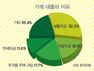 가계 대출 1천조원 시대에도 사람들은 여전히 빚을 낸다. 왜? 한국은행이 전국 도시 2030가구를 대상으로 한 ‘2011년 가계금융조사’를 보면, 지난해 하반기 은행에서 신규대출을 신청한 10가구 가운데 3가구는 생활비 부족을 이유로 들었다. 나머지는 사업자금, 주거용 주택 구입, 전세자금 등을 이유로 들었다. 부동산 바람이 꺾이긴 했나 보다. 2010년 하반기만 해도 대출 이유로 주택 구입(35.2%)을 꼽은 비중이 가장 높았다.
