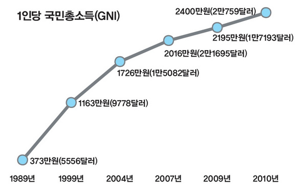 어디 갔어, 이거. 지금은 사라져버린 한국의 전통문화인 이야기가 아니다. 통계청은 3월15일 ‘2011 한국의 사회지표’를 발표했다. 인구·교육·경제 등 여러 사회상이 숫자로 포착됐다. 소득 통계에 눈이 간다. 2010년 현재 한국인의 1인당 국민총소득(GNI)은 2400만원이고 달러 기준으로는 2만759달러에 해당한다. 인구 2천만 명 이상 국가 중 1인당 GNI가 2만달러를 넘는 국가는 많지 않으며 한국이 그중 10번째라고 정부는 지난해 자찬한 바 있다. 통계청은 또 2030년 인구증가율을 0.01%로 예측했다. 어디 갔어, 그 소득들.