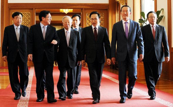 재벌과 보수언론은 ‘한국의 법인세 부담이 높아 기업 해먹기 어렵다’고 떠들지만, 각종 비과세 및 감면 혜택을 받아 기업들이 실제로 내는 법인세는 명목세율보다 상당히 낮다. 지난해 5월3일 청와대에서 이명박 대통령과 경제5단체장이 오찬장으로 향하고 있다. 청와대사진기자단