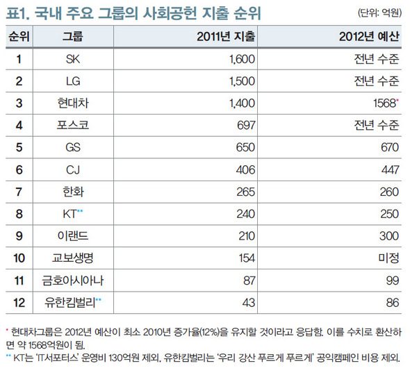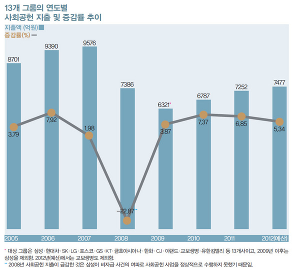 조사 결과에 따르면, 삼성을 제외한 12개 그룹의 2011년 사회공헌 지출은 모두 7252억원으로, 2010년의 6787억원에 비해 6.9% 증가했다(그림 참조). 이는 2010년의 증가율 7.4%보다 다소 낮아진 것이다. 재계 1위인 삼성은 2007년까지는 매년 4천억원이 넘는 사회공헌 지출을 해왔으나 2009년부터 비용 산출의 객관적 기준이 없다는 이유로 사회공헌 지출 내역을 대외적으로 밝히지 않고 있다. 지난해 사회공헌 지출이 가장 많은 그룹은 SK로 1600억원이었다. 그다음은 LG(1500억원), 현대차(1400억원), 포스코(697억원) 순이다(표1 참조). 사회공헌 지출이 2010년 대비 가장 많이 늘어난 그룹은 GS로, 증가율이 44.4%에 달했다. 지역사회 공헌 차원에서 1천억원을 들여 전남 여수의 문화예술공원 ‘예울마루’ 건립사업을 벌인 것이 영향을 끼쳤다. 예울마루는 여수세계박람회 개최에 맞춰 5월에 개관할 예정이다. 그다음은 금호아시아나(24.3%), 교보생명(21.3%), LG(15.4%) 순이다. 반면 사회공헌 지출이 가장 많이 줄어든 그룹은 CJ(-29.8%), 유한킴벌리(-27.1%) 등의 순서다. 유한킴벌리는 공장이전 비용 증가로 영업이익이 감소한 것을 주요 원인으로 꼽았다.