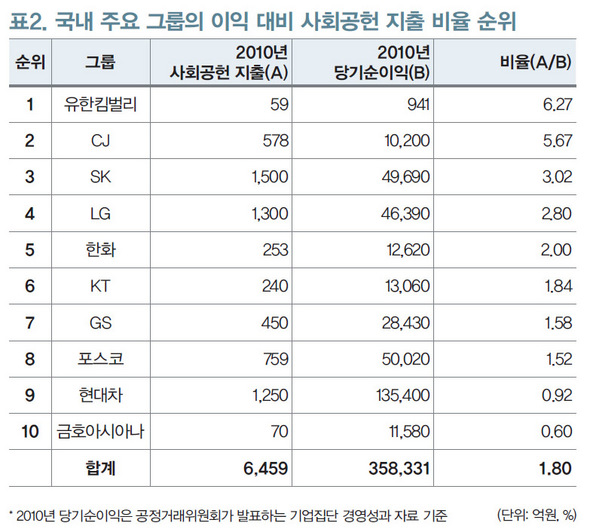 삼성과 교보생명을 제외한 11개 그룹의 2012년 사회공헌 예산은 7477억원으로 집계됐다. 이는 11개 그룹의 지난해 사회공헌 지출에 비해 5.3% 많은 것이다. 교보생명은 3월 결산법인으로 2011년도 결산이 마무리되지 않아 2012년 예산이 아직 미확정 상태라서 분석 대상에서 제외됐다. 수치상으로만 보면 올해 사회공헌 예산 증가율은 2008년 글로벌 금융위기 이후 가장 낮은 수준이다. SK·LG·포스코 등 사회공헌 지출이 많은 상위 그룹들이 올해 예산을 지난해 수준 정도라고 응답한 것이 큰 영향을 끼쳤다. 2009∼2011년 3년간 사회공헌 지출의 평균 증가율은 6%였다. 하지만 실제 올해 사회공헌 지출은 예산보다 더 늘어날 가능성이 높다. 기업의 사회책임 요구가 갈수록 커지고, 총선과 대선에서 경제민주화가 최대 쟁점으로 떠오르는 사회적 분위기가 기업 사회공헌에도 영향을 끼치고 있기 때문이다. 현대차의 이병훈 사회문화팀장은 “각 계열사들이 사회적 분위기를 고려해 사회공헌 활동을 더욱 적극적으로 펼칠 것으로 보여 실제 지출은 예산보다 더 늘어날 것”이라고 말했다. 장인성 삼성사회봉사단 상무도 “기업들이 전반적으로 최근의 사회 분위기 변화를 심각하게 받아들이고 있다”며 “삼성의 사회공헌 지출이 지난해보다 늘어날 것은 분명하다”고 말했다. 그룹별 올해 사회공헌 예산 증가율은 ‘순이익의 10% 사회환원’ 원칙을 천명하는 이랜드가 42.9%로 가장 높다. 이랜드는 해외사업 확장 추세에 맞춰 중국 등을 중심으로 글로벌 사회공헌 사업을 확대하고 있다. 금호아시아나(13.8%)와 CJ(10.1%)도 예산 증가율이 두 자릿수를 기록했다. 사회공헌 지출은 절대규모도 중요하지만, 기업이 거둔 이익 중에서 얼마나 사회를 위해 쓰느냐를 파악하는 것이 더 중요하다. 2010년 기준으로 현대차·SK·LG·포스코·GS·한화·KT·금호아시아나·CJ·유한킴벌리 등 주요 10개 그룹의 이익 대비 사회공헌 지출 비율은 평균 1.8%로 나타났다(표2 참조). 그룹별로는 유한킴벌리가 6.3%로 가장 높고 CJ(5.7%), SK(3.0%), LG(2.8%), 한화(2.0%) 순이다. 국내 기업들의 이익 대비 사회공헌 지출 비율은 미국 등 선진국 기업들에 비해 높은 것으로 알려졌다. 전국경제인연합회의 <사회공헌백서>에 따르면 2010년 500대 기업의 평균 사회공헌 비용은 전년 대비 8.4% 증가했고, 경상이익 대비 사회공헌 지출은 3.2%를 기록했다. 주요 그룹들이 올해 새롭게 시작하는 사회공헌 프로그램들은 일자리 확충, 양극화 해소, 노인 문제, 환경, 다문화가정 지원 등 사회적 요구를 해결하는 데 무게중심을 두고 있는 것이 특징이다. 이병훈 현대차그룹 사회문화팀장은 “자활 의지가 있는 저소득층에게 차량 지원을 하는 ‘희망드림기프트카사업’과 사회적 기업을 통한 일자리 확충 사업을 중점적으로 추진해나갈 계획”이라고 말했다. 한화그룹도 친환경 사회적 기업에 운영비와 개발비 등을 지원하고, 사회적 기업 종사자를 위한 포럼과 워크숍을 병행해 사회적 기업 생태계를 활성화하는 데 적극 나설 계획이라고 했다. 교보생명은 청년 일자리 및 리더십 프로그램 관련 사업을 검토 중이다.