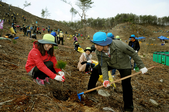 생활용품업계 1위인 유한킴벌리가 3월31일 경기도 이천시 호법면에서 ‘우리강산 푸르게 푸르게’ 캠페인의 일환으로 개최한 제29회 신혼부부 나무심기 행사에 신혼부부 600쌍 등 모두 800여명이 산비탈에 나무를 심고 있다. 유한킴벌리 제공