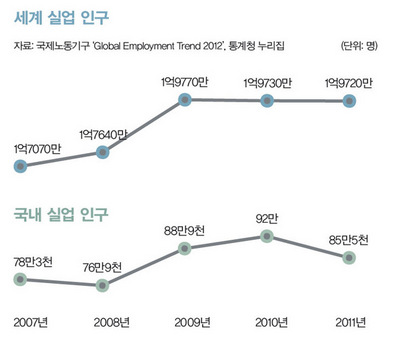 지난 1월에 나온 국제노동기구(ILO)의 통계를 보면, 지난해 11월 말 기준 전세계 실업자 수는 2억 명에 육박하고 있다. 전세계적인 경기침체가 닥치기 전인 2007년보다 실업 인구가 무려 2650만 명이나 늘어났다. ILO는 고용시장이 흔들려 청년 및 저숙련 노동자 등 고용 취약 계층의 피해가 가장 크다고 풀이했다. 실업은 전세계가 골머리를 앓는 문제다. 스페인의 청년 실업률은 50.5%까지 뛰어올랐다. 우리나라에서도 지난 4년 사이에 실업 인구가 7만2천 명이나 늘었다.