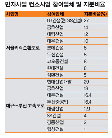 하지만 국내 민자사업은 겉으로는 SPC를 설립하고 일부 재무적 투자자를 끌어들여 흉내를 내고 있지만, 실제로는 철저히 건설업체들 중심의 사업구조라고 할 수 있다. 특히 상위 재벌급 건설업체들이 한두 개의 컨소시엄을 구성해 민자사업을 따낸 뒤 출자 비율만큼 서로 시공권을 나눠 갖는 담합 구조를 보인다. 외부 재무적 투자자의 비율이 현저하게 낮고, 건설업체들끼리 상호 출자하는 경우가 대부분이다. 특히 도로사업은 거의 대부분 사업을 따낸 건설업체 컨소시엄만으로 SPC가 구성된다(표 참조).