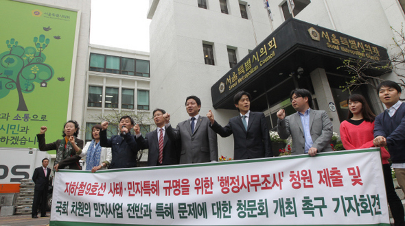 참여연대와 민주사회를위한변호사모임 회원들이 지난 4월23일 오후 서울 태평로 서울시의회 앞에서 ‘지하철 9호선 사태 민자특혜 규명을 위한 행정사무조사 청원 제출 및 국회 차원의 특혜 문제에 대한 청문회 개최 촉구 기자회견’을 열고 있다. <한겨레> 신소영 기자