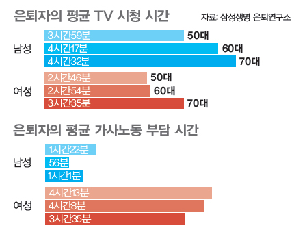 일천구백구십팔년 외환위기 이래로 우리의 어머니들께서는 이런 농담을 만들어 세상에 퍼뜨리셨다. 집에서 따뜻한 밥 한 끼 못 챙겨먹을 정도로 직장일에 바쁜 남편(0食)과 밥 세 끼에 ‘야식 추가!’를 외치는 겁을 상실한 무직자 남편(4食)은 호칭부터 구별해야 한다는 농담에는 이 땅의 노동 유연화를 개탄하는 의미도 숨어 있다(아니면 말고). 이처럼 구전으로만 전해져오던 은퇴 남녀의 갈등이 최근 적나라한(?) 통계로 드러났다. 7월12일 삼성생명 은퇴연구소가 은퇴자 3826명의 여가를 분석한 자료를 보면, 남성은 TV 시청에, 여성은 집안 일에 하루 중 가장 많은 시간을 쓰고 있었다. 한마디로 남성은 ‘쇼파남’, 여성은 ‘싱크대녀’인 셈이다. 게다가 미국 남성의 가사 활동 시간은 한국 남성의 2~3배라는 것! 요즘, ‘우리나라 대통령’이 ‘내 꿈이 이루어지는 나라’를 만들어 ‘저녁이 있는 삶’을 만들어주겠다고 하는데, 은퇴 남녀의 삶에도 신경을 써주시길!