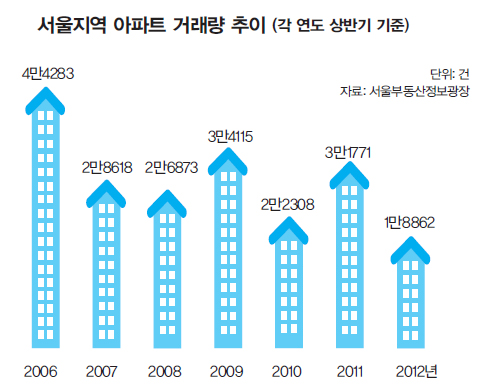 마지막까지 고약한 MB식 부동산 정책 DTI 규제 완화는 딱 MB 스타일이다. 이명박 정부는 취임 직후부터 경기가 꺼지는 고비마다 부동산 시장을 활용했다. 부동산 거래가 활성화돼야 건설업계에 돈이 돌아 경기가 살아난 듯 보이고, 집 보유자들은 계속 부자인 것처럼 느낄 수 있기 때문이다. 2008년 글로벌 금융위기 이후 전세계적으로 부동산 거품이 꺼져갔지만, 이명박 정부는 부동산으로 돈이 계속 흘러들게 안간힘을 썼다. 유일한 방법은 규제 완화였다. 스무 차례 넘는 부동산 대책을 통해 거래 비용은 낮춰주고, 투자수익은 높여줬다. 다주택자 양도소득세와 종합부동산세는 사실상 무력화시켰고, 투기과열 지역도 차례로 해제했다. 재건축·재개발 기준은 완화했고, 아파트 전매제한도 풀어줬다. 이 과정에서 가계가 빚을 내 집을 사고, 부족한 생활비는 다른 빚으로 감당해야 했다. 가계부채가 눈덩이처럼 불어났다. 가계부채는 MB 집권 직전인 2007년 말 665조원에서 지난 말 912조원으로 수직 상승했다. 부동산 시장에 돈이 부족하면 공기업들을 활용했다. 4대강에 수자원공사가, 보금자리주택사업에 토지주택공사(LH)가 동원됐다. 특히 임기 마지막 해인 올해에는 온갖 수단을 다 동원할 분위기다. DTI 규제 완화를 내놓기 이전인 지난 5월 ‘5·10 대책’을 통해 마지막 남은 규제 대못들을 모조리 뽑겠다고 선언했다. 이에 따라 정부는 민영주택에 대한 분양가 상한제 폐지와 재건축 초과이익환수 중지를 입법화하기로 지난 7월 새누리당과 협의를 마쳤다. 다주택자 양도소득세 중과 폐지는 새누리당이 반대하고 있지만, 계속 추진하겠다며 일단 국무회의를 통과시킨 상태다. 모두 부동산 거품을 유지시켜 건설사와 부동산 부자들이 계속 돈을 벌도록 도와주는 대책이다. 서민의 삶은 정부의 안중에 없다. 앞서 이명박 정부의 부동산 정책이 거래를 활성화하는 데 모두 실패했듯, 이번 규제 완화들도 실패할 가능성이 높다. 부동산 부양 대책은 투자자나 실수요자들의 욕망에 뒷받침돼야 성공한다. 빚을 내서 투자해도 수익이 나겠다는 확신이 서야 집을 산다. 그러나 시장에서 작년 하반기부터 이런 기대는 완전히 사라졌다. 유럽 재정위기 여파로 부동산 가격 하락에 대한 불안감이 극에 달해 거래가 뚝 끊겼다. 서울지역 아파트 거래량은 상반기 기준으로 2008년 4만6873건에서 올해 1만8862건으로 쪼그라들었다. 반토막도 안 된다. 가격도 계속 떨어지고 있다. 강남 불패신화의 상징인 대치동 은마아파트 101.7㎡(공급 면적)는 최고점이었던 2006년 11월 11억6천만원에서 현재 8억원대로 내려앉았다. 투자자건 실수요자건, 부동산 가격이 상승·반전할 것이란 신호가 있기 전에는 주머니에 돈을 쌓아놓았더라도 집을 사기는 어려운 상황이다. 조명래 단국대 교수는 이 지경에서 정부가 내놓은 조처들이 “고약하다”고 비판했다. “부동산의 구조가 바뀌고 있다. 집값이 떨어질 거다. 정책 하나로 반전시킬 상황이 아니다. 실물 약화로 소득마저 줄어드는 이때에 과도하게 돈을 빌려서 사라고 하는 건 무책임하다. 정부가 국민의 금융생활을 보호해도 모자랄 판에 오히려 위태롭게 몰고 간다.” 이 규제 완화들은 부동산 거래도 활성화시키지 못하고 시장만 더 왜곡시킬 가능성이 높다. “이미 부동산은 구조적인 침체기에 들어갔기 때문에 정부가 현실을 정확히 인식해야 한다. 가계부채 1천조원을 쌓아놓고 부동산 거품을 아무런 충격 없이 뺄 수는 없다. 부동산 거품을 냉정하게, 점진적으로 빼야 한다. 지금처럼 자기 임기 안에 별 탈 없이 임기응변식으로 버티면 된다고 생각하면 안 된다. 부자나 건설업계를 살리려고 부동산 활성화를 하다 보면 결국 하우스푸어의 고통만 가중되고, 서민이 다 죽는다.”(선대인 선대인경제전략연구소 소장)