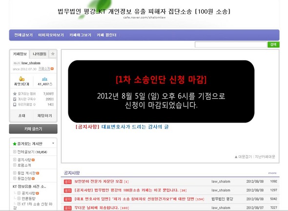 고객이 맡긴 개인 정보를 도둑맞은 KT는 사건 뒤 “보안의식을 더욱 철저히 강화하겠다”는 내용을 담은 사과문을 내놓았다. 그러나 KT의 ‘미지근한’ 사과는 오히려 870만 피해자들의 화를 돋구었다. 사건이 알려지자마자, 인터넷 포털사이트에는 KT를 상대로 집단으로 손해배상 청구 소송을 진행하려는 피해자들의 인터넷 까페 10여 곳이 순식간에 문을 열었다. 피해자들이 자발적으로 문을 연 곳도 있었으나, 사람들이 많이 모인 곳은 법무법인에서 직접 문을 연 까페였다. 가장 많은 이들이 모인 곳은 ‘법무법인 평강’에서 연 인터넷 카페 ‘법무법인 평강 KT 100원 집단소송’(cafe.naver.com/shalomlaw)이다. 지난 8월10일 기준으로, 회원 수만 4만 명을 넘어섰다. 법무법인 평강이 “변론비 100원과 인지대(소송 신청 때 법원에 내는 접수비) 2500원만 받고 소송을 진행하겠다”고 하자 피해자들이 몰렸다. 이곳은 지난 8월5일 3만2000여명 규모의 1차 소송단 접수를 마쳤다. 법무법인 평강 쪽은 “대기업의 개인 정보에 대한 안전 불감증에 경각심을 일깨우고, 사회에 경종을 울리고자 KT 사태와 관련한 집단소송을 계획하게 됐다”고 밝혔다.(상자 기사 참조)
