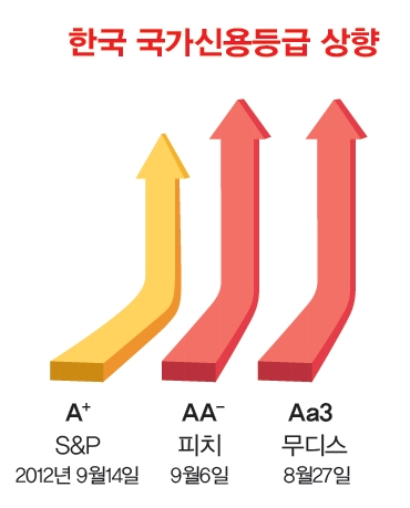 미국 3대 신용평가사 중 하나인 스탠더드앤드푸어스(S&P)가 9월14일 한국의 국가신용등급을 ‘A’에서 ‘A+’로 한 단계 상향 조정했다. S&P 기준으로 중국과 일본은 우리보다 한 단계 높은 ‘AA-’ 등급이다. 지난 8월27일 국제신용평가사 무디스도 한국의 신용등급을 역대 최고인 ‘Aa3’(안정적)으로 상향 조정했다. 9월6일에는 피치가 일본보다 높은 ‘AA-’로 한국 등급을 한 단계 끌어올렸다. 3개 신용평가사 종합 기준으로 1996~97년 기록했던 역대 최고 등급 수준을 15년 만에 회복하게 됐다.