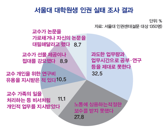 취업 준비생만 팍팍한 게 아니었다. 대학원생들은 ‘취업 스펙 3종 세트’(학점·인턴경력·어학점수) 대신 야근·접대·허드렛일로 이어지는 ‘조교 스펙 3종 세트’에 고통받고 있었다. 서울대 인권센터가 대학원생 1350명을 대상으로 조사한 인권 실태 결과를 10월10일 발표했다. 대학원생 상당수는 교수에게서 보수도 받지 못하는 과도한 업무를 지시받아 공부할 시간을 빼앗기는 것은 물론, 연구비 유용과 논문 대필, 게다가 선물·접대 강요를 받기도 했다고 답했다. “출장 간 교수님 빈집에 가서 개밥을 줬다” “교수님 이삿짐을 날랐다”는 증언도 나왔다. 교수님, 대학원생들이 공부만 열심히 하도록 두면 안 될까요.