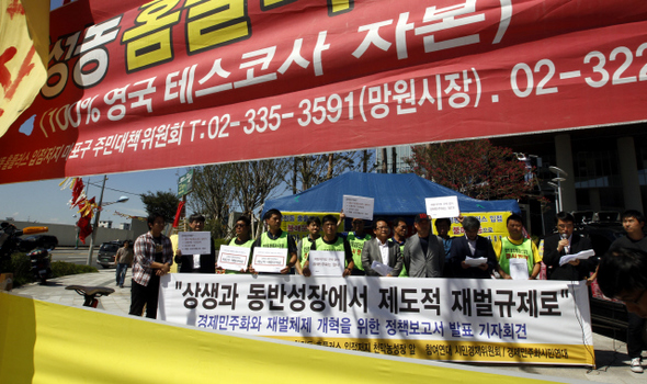 지난 9월6일 참여연대가 서울 마포구 합정동 홈플러스 입점 저지 농성장에서 경제민주화와 재벌체제 개혁을 위한 정책보고서 발표 기자회견을 하고 있다. 한겨레 김경호
