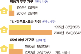서울살이, 말처럼 쉽지 않았다. 15년 사이 서울에 사는 부부 10쌍 가운데 1쌍은 떨어져 살고, 고령인데도 가족 생계를 책임지는 이도 3배 가까이 늘었다. 서울시가 11월8일 통계청의 1995∼2010년 인구주택총조사를 분석해 만든 ‘통계로 보는 서울시민 가족생활’ 자료를 발표했다. 여기에는 서울에 사는 비동거 부부 가구 수가 1995년 13만1천 가구에서 2010년 21만1천 가구로, 8만여 가구(61.1%) 늘어난 것으로 나타났다. 이 가운데 44.2%는 직장을 이유로, 34.5%는 자녀 교육 등 학업을 이유로 떨어져 지냈다. 가족의 생계를 책임지는 65살 이상 가구주는 2.9배 늘어난 52만7590명이었다. 서울 가구 가운데 1인·한부모·‘조부모+손자녀’ 가구 수는 92% 늘어났지만, 전통적 가족 형태인 ‘부모+미혼자녀 가구’ 또는 ‘3세대 이상 가구’는 15% 줄었다. 늘어나는 숫자 안에 도시 생활의 고단함이 배어나오는 듯하다.