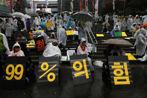 지난해 10월15일 서울역 광장에서 빈곤사회시민연대 회원들이 “빈곤사회 1%에 맞선 99%의 힘으로 세상을 바꾸자”며 집회를 벌이고 있다. 한겨레 류우종 기자
