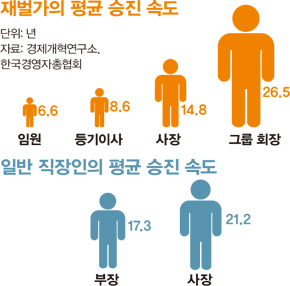 말 그대로 ‘파죽지세’다. 이재용(44) 삼성전자 부회장의 ‘승진운’ 말이다. 그는 12월5일 삼성그룹 인사 발표에서 ‘또’ 승진했다. 2009년 말 부사장, 2010년 말 사장 승진에 이어 2년 만이다. 재벌 3세의 ‘초고속 승진’을 바라보는 사회의 시선이 따갑지만, 그는 속으로 이렇게 생각할지 모른다. 1991년 삼성에 부장으로 처음 입사해 21년 만에 부회장을 달았는데 이게 뭐가 빠르냐고. 경제개혁연구소가 지난 9월 발표한 보고서를 보면, 확실히 그의 승진 속도는 ‘재벌가 평균’이긴 하다. 삼성·현대차·SK 등 상위 20대 재벌의 총수 일가 107명의 승진 속도를 분석해보니, 임원에 오르는 평균 기간은 6.6년, 개별 기업 사장은 14.8년, 그룹 회장은 26.5년이 걸렸기 때문이다. 그런데 일반 직장인들은 부장 달려고 꼬박 17.3년을 고생한다는 걸 당신은 아느뇨?