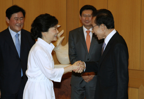 지난 9월2일 청와대를 방문한 박근혜 새누리당 대선 후보를 이명박 대통령이 맞이하고 있다. 청와대사진기자단