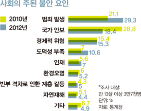 북한은 주적이란다. <국방백서>에 실린 표현 따위는 눈속임이다. 윗분들이 그렇다면, 여전히 그런 거 다. 하지만 국민의 마음속 주적은 이미 바뀌었다. 통계청이 12월20일 발표한 ‘2012년 사회조사 결 과’를 보면 ‘범죄 발생’이 사회 안전을 위협하는 가장 큰 불안 요인으로 꼽혔다. 만 13살 이상 인구 3 만7천 명을 조사한 결과다. 1위이던 ‘국가안보’는 큰 차이로 2위로 밀려났다. 이어 경제적 위험, 도덕 성 부족, 인재(人災) 등이 사회 불안 요인으로 지목됐다. 애석하게도, ‘그’분이 사회악이라 외친 불량 식품은 불안 축에도 못 들었다. 앞으로 애먼 적들 때려잡는다며 괜히 사회 불안만 키우는 건 아닐지 벌써부터 불안하다. 통계청장님, 다음 조사부턴 ‘그’분을 설문 선택지에 넣어주면 안 되나요?