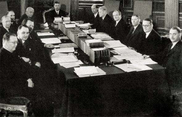 사회민주노동당 소속의 페르 알빈 한손 스웨덴 총리(왼쪽 시계방향으로 여섯 번째)가 1939년 스톡홀름 왕궁에서 구스타프 아돌프 왕자(일곱 번째)의 주재로 회의를 하고 있다. 위키피디아 갈무리