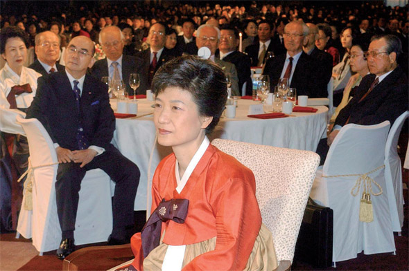 2004년 12월14일 서울 광장동 워커힐호텔에서 열린 박지만씨의 결혼식에서 박근혜 당시 한나라당 대표 뒤에 하객으로 참석한 김종필 전 자민련 총재와 박태준 전 총리가 보인다. 국회사진기자단